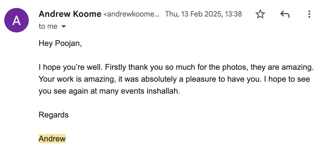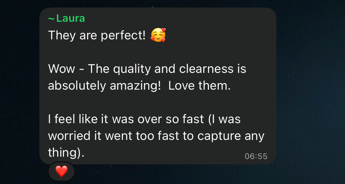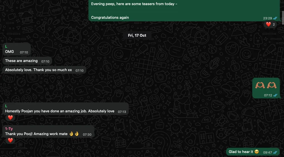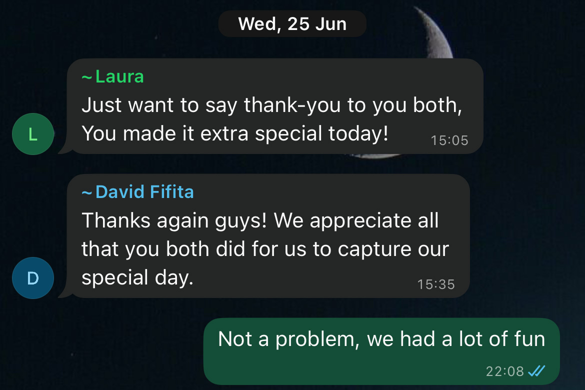 Book in a call, see if you like us and our previous work, pay a 50% non-refundable retainer and sign a contract to book in your dates.
